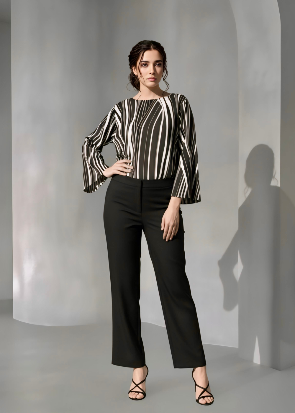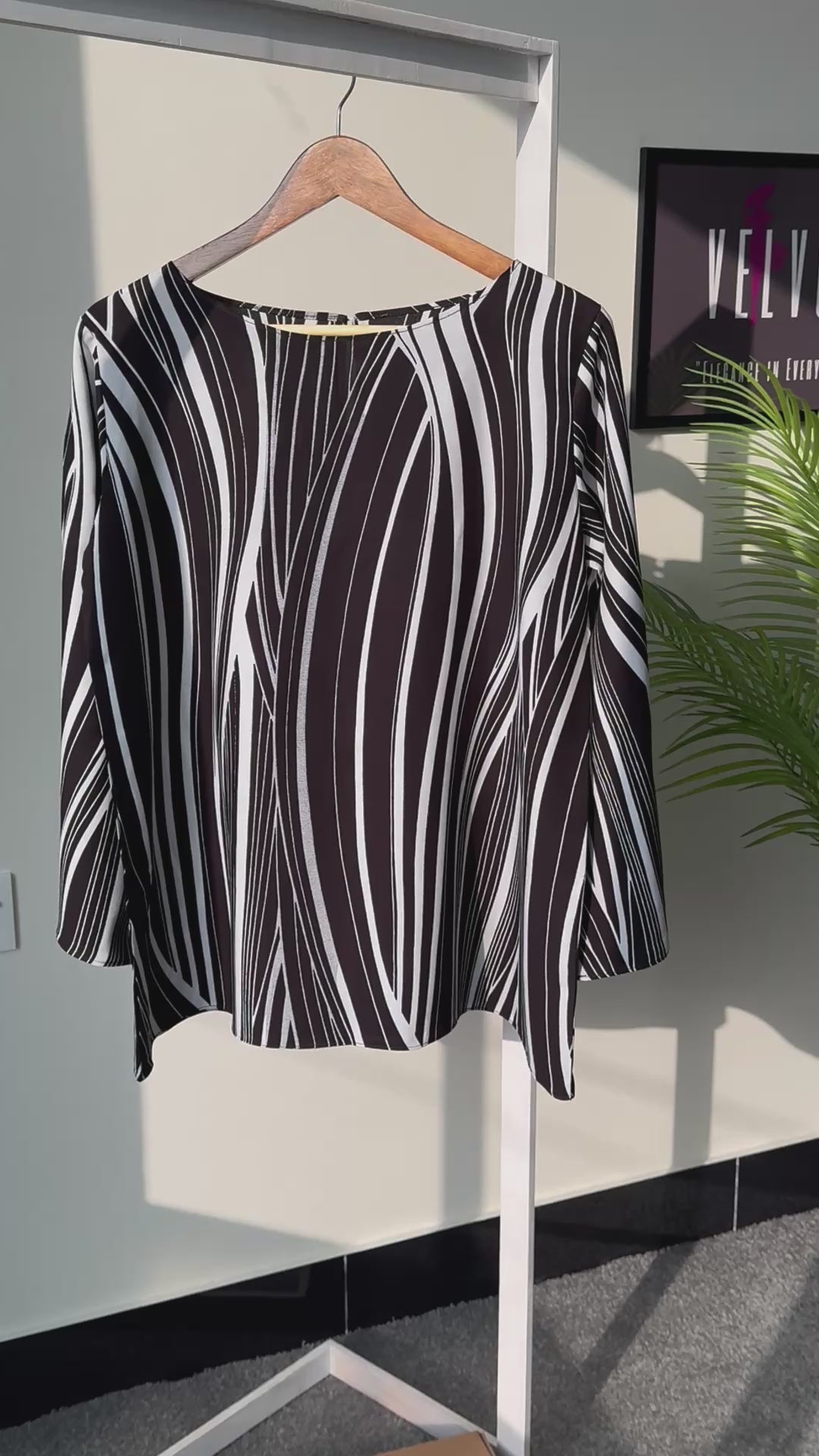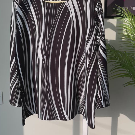 Top with an imported Rayon fabric with flowing white lines on a black background.
