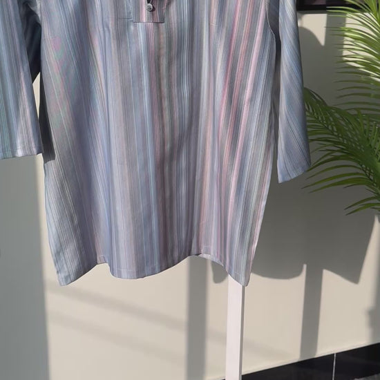 - It has a V-slit neckline with a short standing collar, blending casual comfort with a touch of structure.