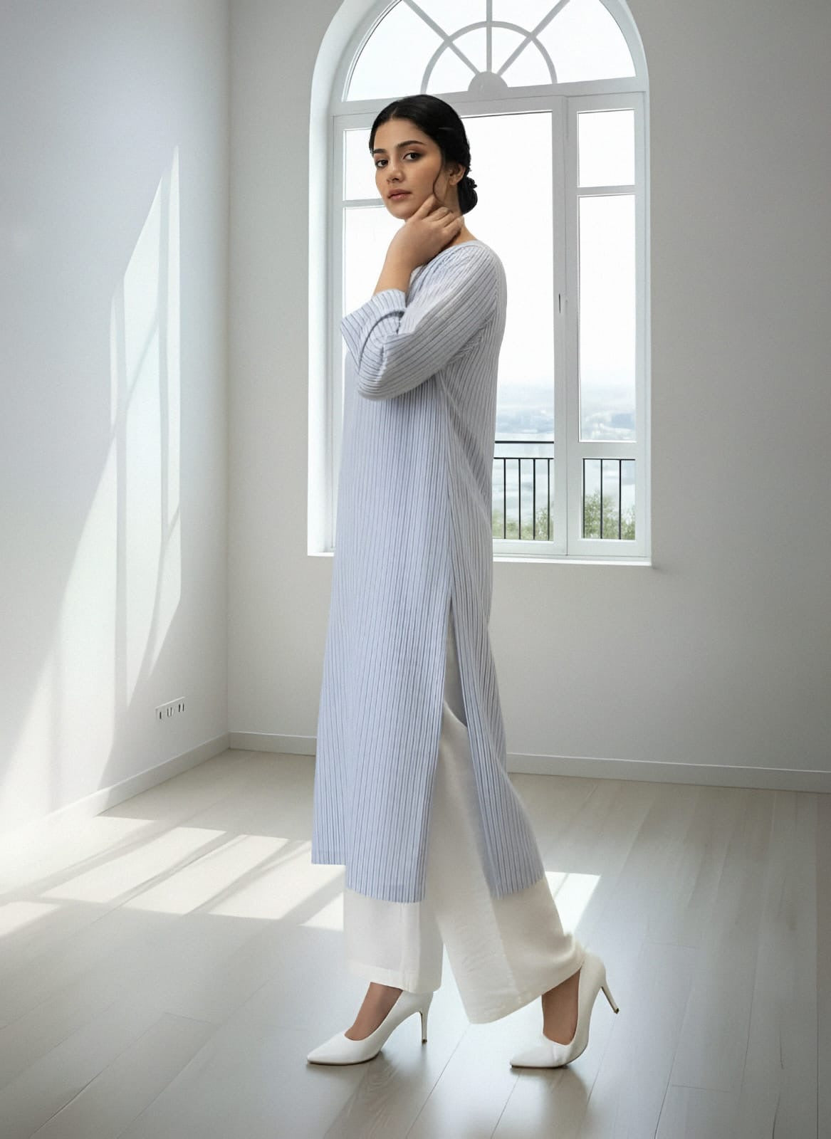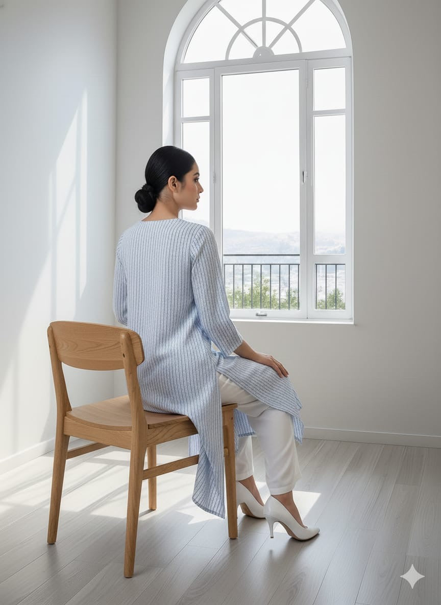 Outfit with imported cotton check with a blend linen smooth trouser with a fine vertical pinstripe pattern in blue on a white base.